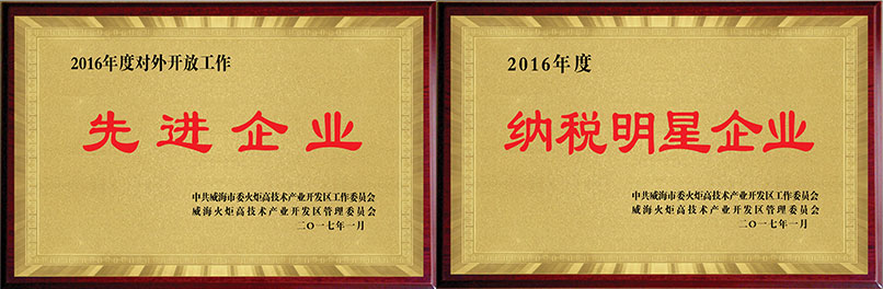 2016年公司經過全體努力取得了傲人的成績,在威海高區的年度表彰會上:我們榮獲“納稅明星企業”、“創新平臺建設先進企業“、”科技創新先進企業“、”科學技術一等獎“、”對外貿易先進企業“等榮譽及稱號。