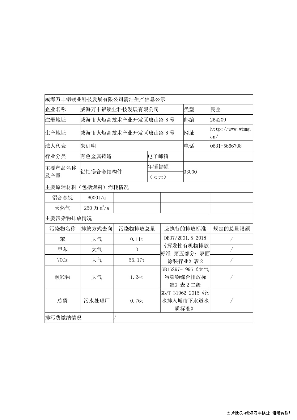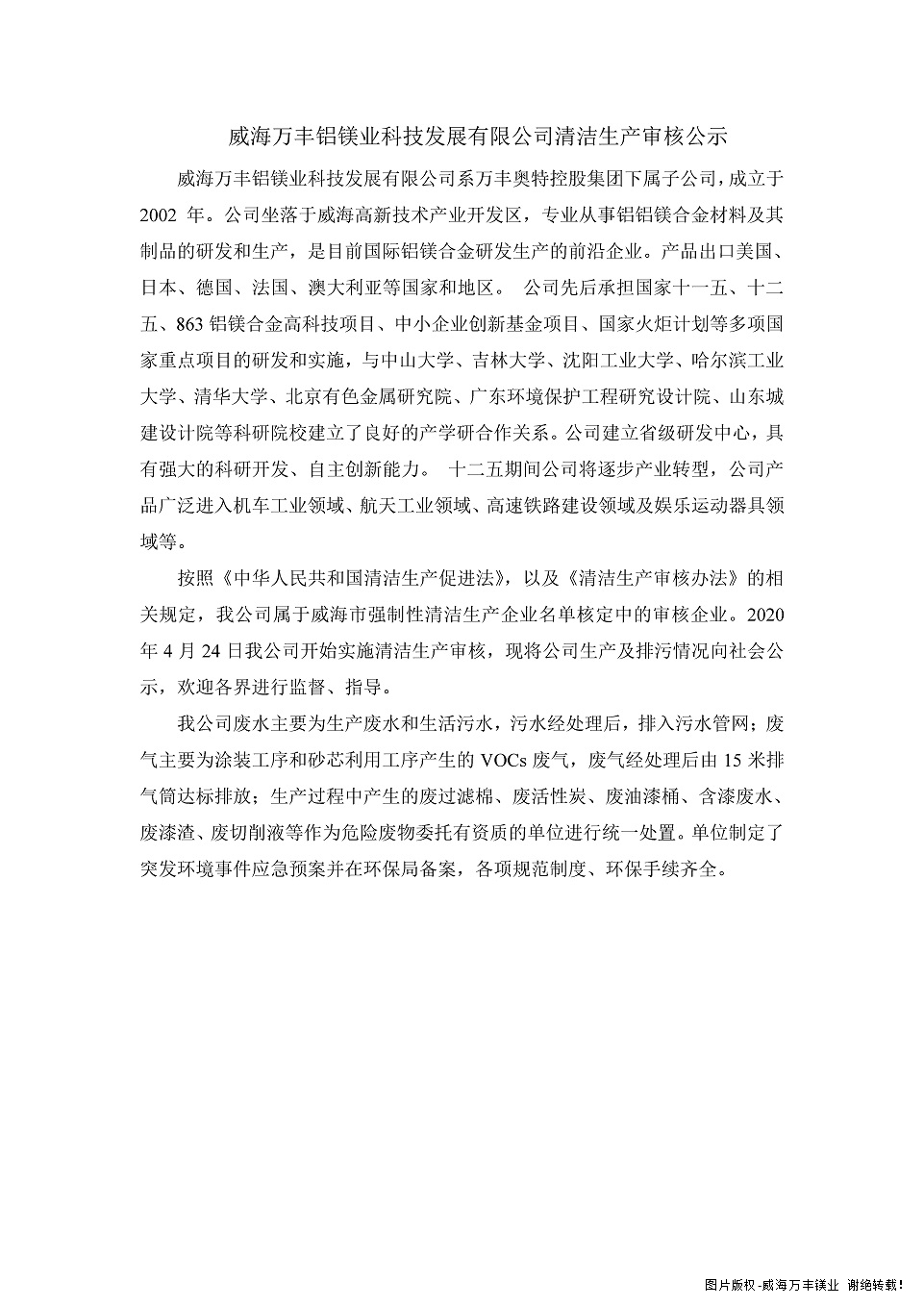 威海萬豐鋁鎂業科技發展有限公司清潔生產審核公示