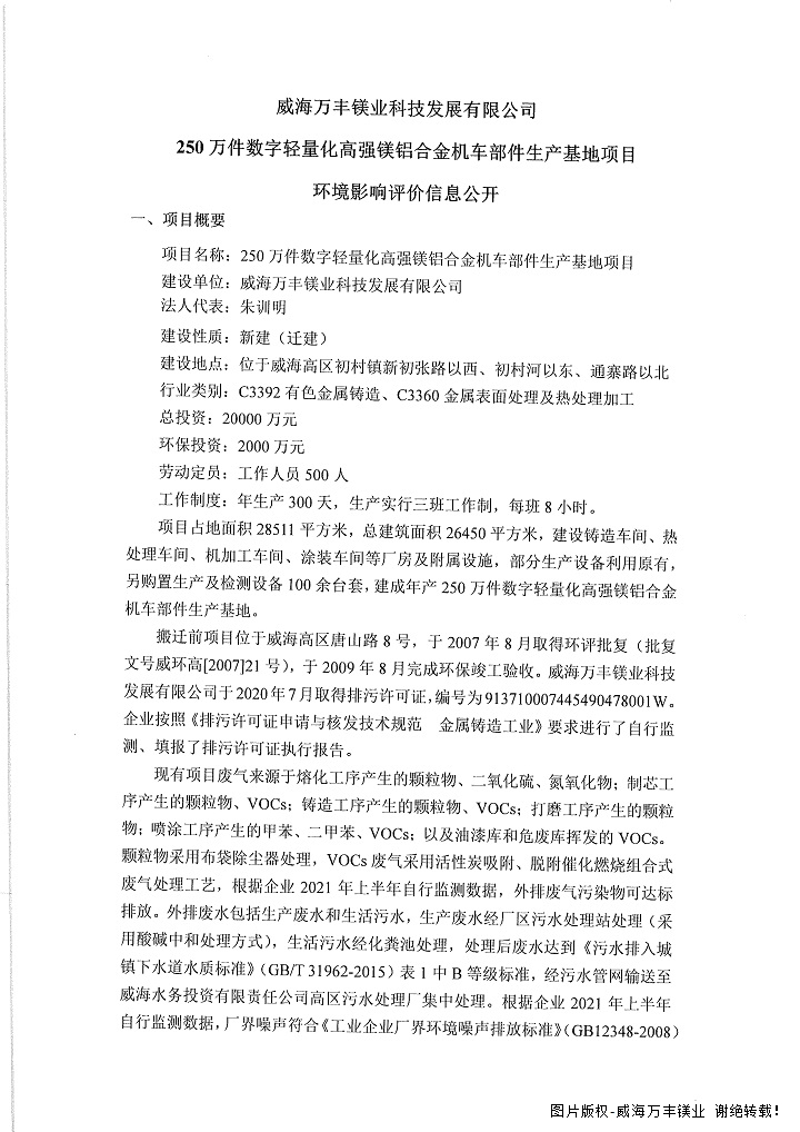 250萬件數字輕量化高強鎂鋁合金機車部件生產基地項目環境評價信息公開